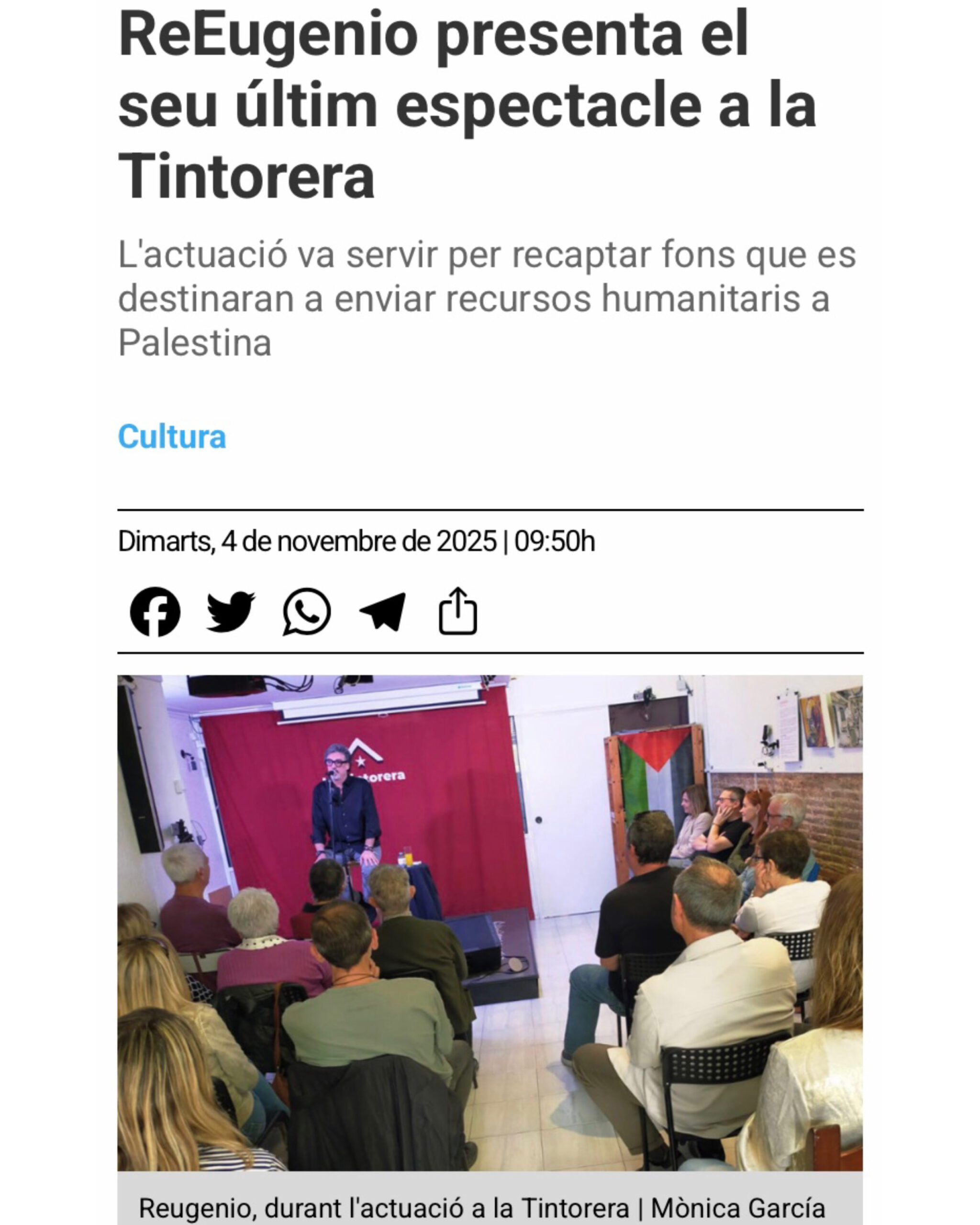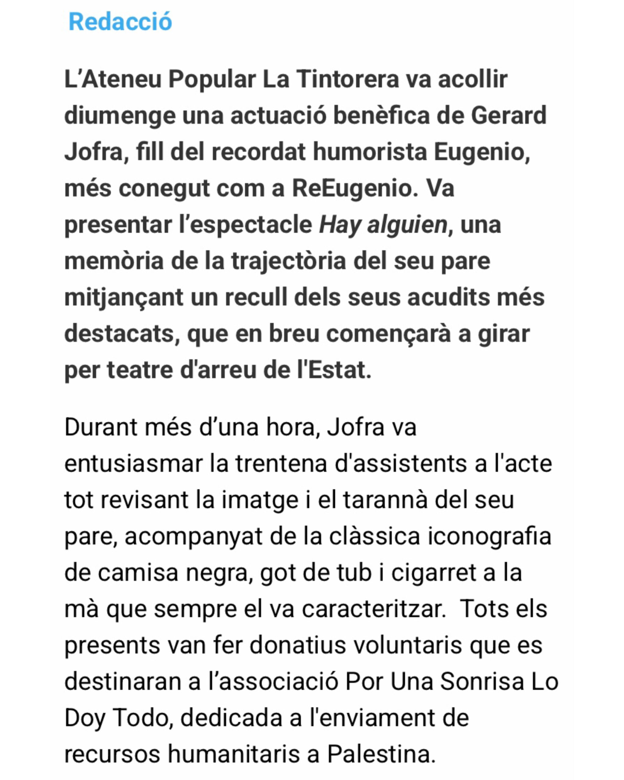 El passat diumenge vam omplir @ap_latintorera amb l’humor del REUGENIO. Gràcies a tots els que ho van fer possible i ens van acompanyar. Aquests riures es transformaran en aliments i aigua pels desplaçats a la franja de GAZA. Seguim!🇵🇸✊🏼